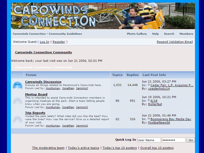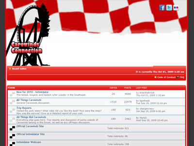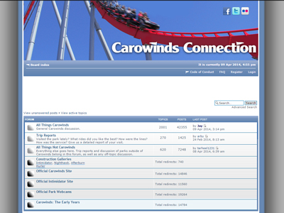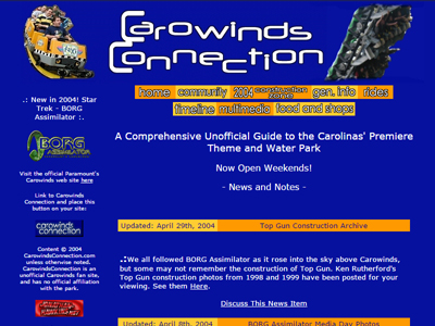 Carowinds Connection was created in August 2003 to track a construction project that would ultimately become the BORG Assimilator (now Nighthawk) roller coaster. Since then it has become one of the most popular amusement park websites and the definitive unofficial Carowinds fan site. The site has served nearly 2.5 million visitors with over 25 million page views and 1,400 registered members. It has been referenced in the Charlotte Observer, Rock Hill Herald, Charlotte Business Journal, Visit Charlotte, and other publications and websites. Carowinds Connection members have been invited to new ride announcements and media days and are regular attendees at events held by the American Coaster Enthusiasts and other amusement park clubs.